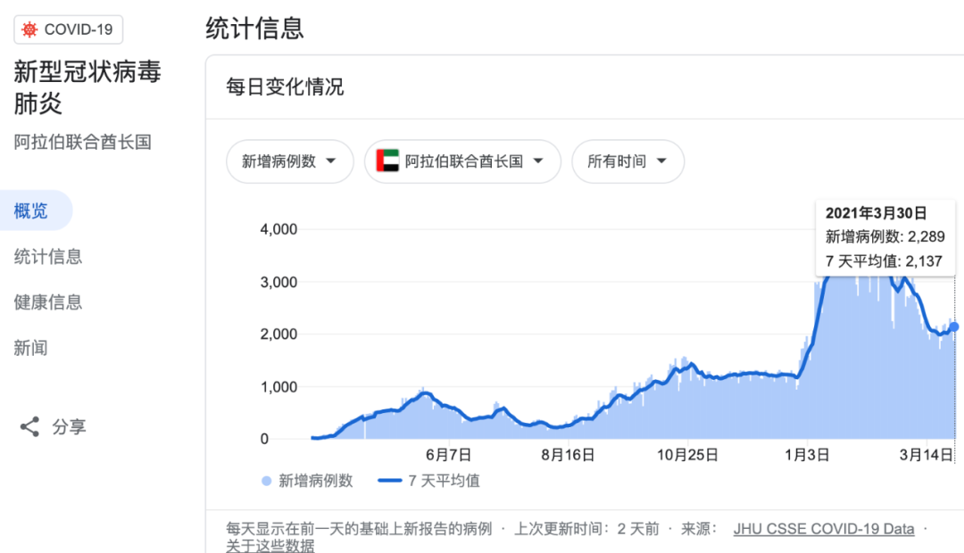 2021年3月21日,阿联酋疫情新增2084例,死亡5例。累计确诊总数46万1,444例.