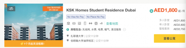 对于新生,大学宿舍无疑对于新生适应迪拜的环境是最佳的选择。有些宿舍位于校园外,学校会提供宿舍到学校的交通;有些学校的宿舍位于学位校园。学校的宿舍数量有限,费用相对于其他几种而言也会稍稍贵一些,一般每月住宿费在4-10K RMB之间。单人间一般在7-10K RMB,双人间每人6-8K,配备四人间一般在3-5KRMB之间,同学们可根据自己的实际情况进行选择。